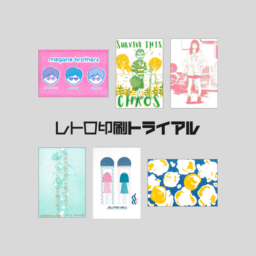 レトロ印刷トライアルとは、レトロ印刷の可能性をみなさんと一緒に探る公募展です。 全国のクリエイターさんにレトロ印刷でやってみたいことにトライアル(=試行)していただきました。 記念すべき第一回目はレトロ印刷の特徴でもある「ズレる」をテーマに100種類もの作品が集まりました。 クリエイターさんたちによる個性豊かな「ズレる」の表現と、レトロ印刷ならではの味をお楽しみください!