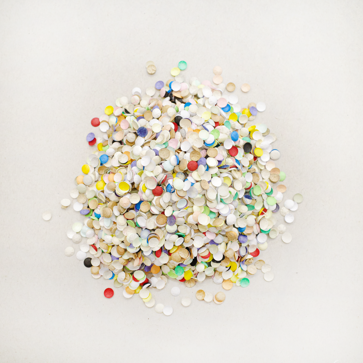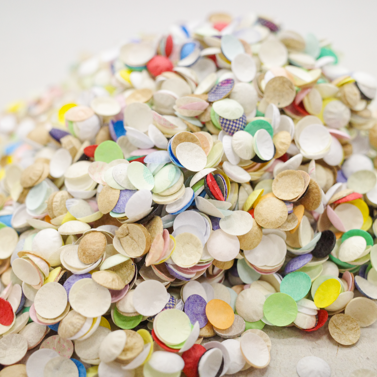 レトロ印刷のオプション加工「穴あけ」を行う際に出る、丸くくり抜かれた紙ゴミです。