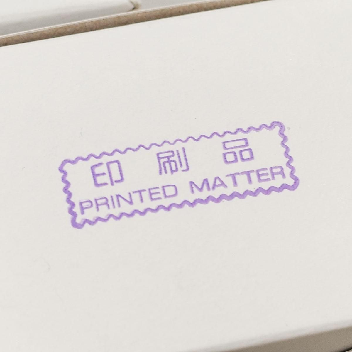 「印刷品」の文字が捺せるできる浸透印タイプのスタンプ。インクは紫っぽい発色です。