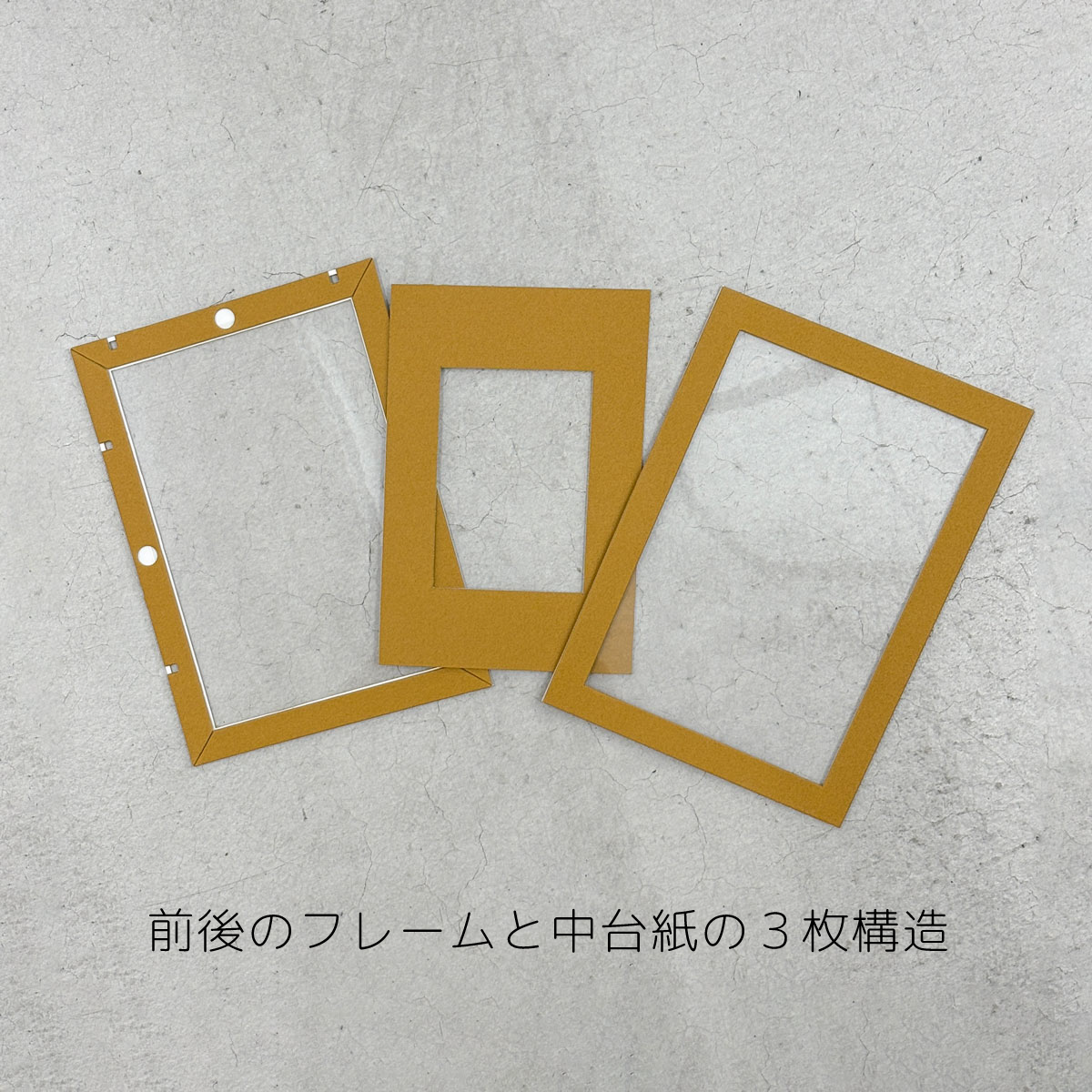前後のフレームと中台紙で構成されており、中台紙を取り外すことで透明な余白を作るスッキリした印象で飾ることも可能です。前後のフレームにはマグネットが内蔵されており、工具や金具なしでフレーム同士がパチッと引っ付きます。