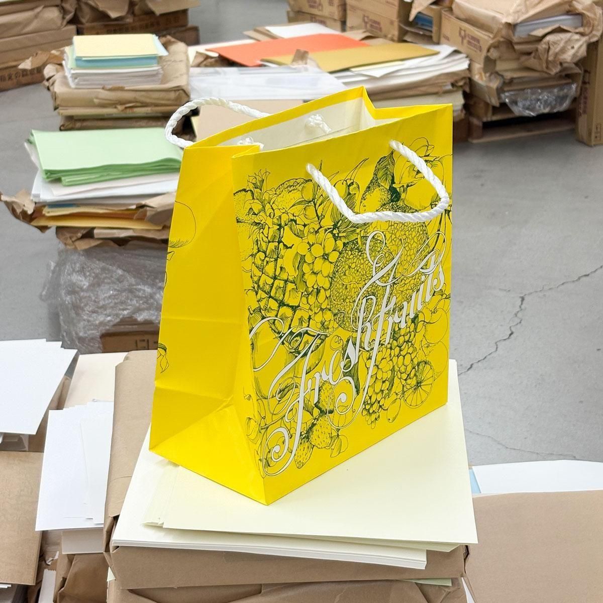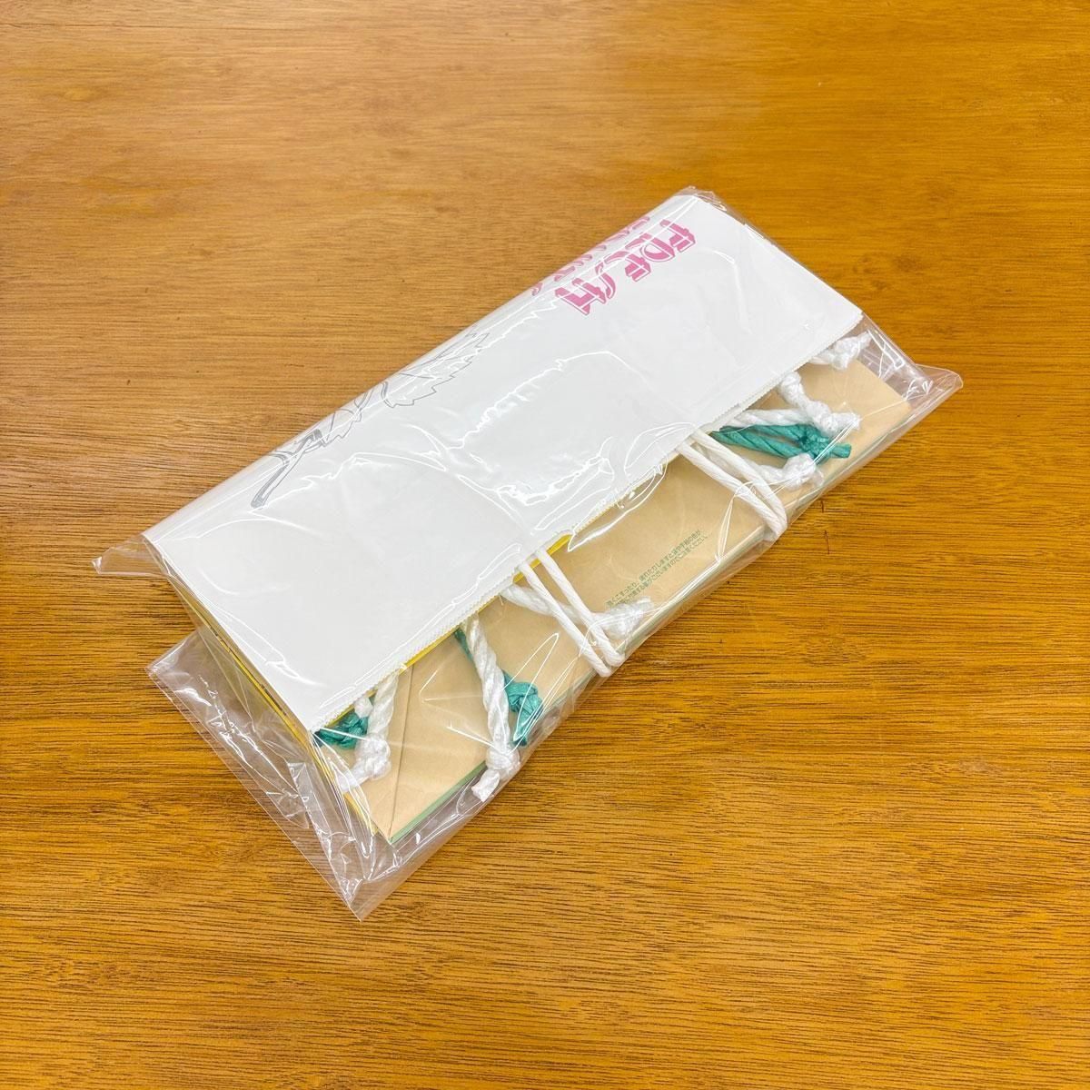 写真6枚目のようにまとめて折りたたんで、透明袋に入れてお送りします。紙袋は元々中央横向きに折り跡があります。