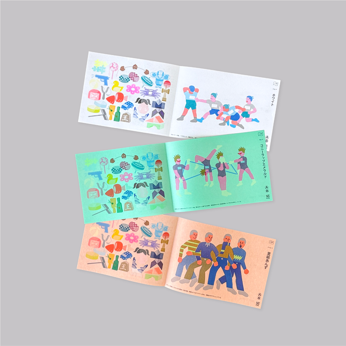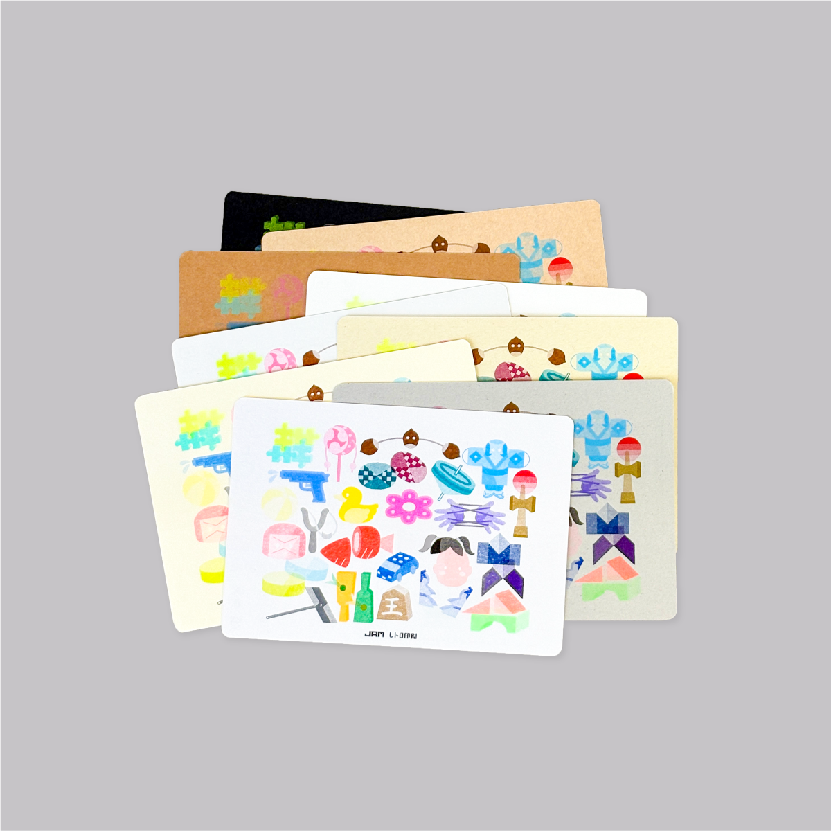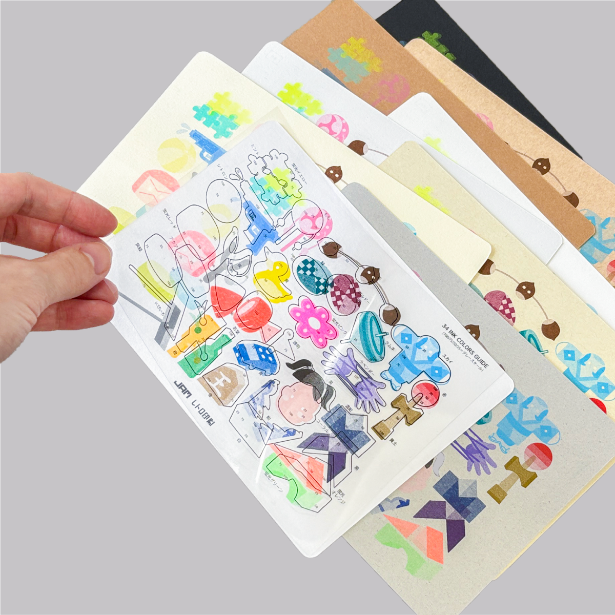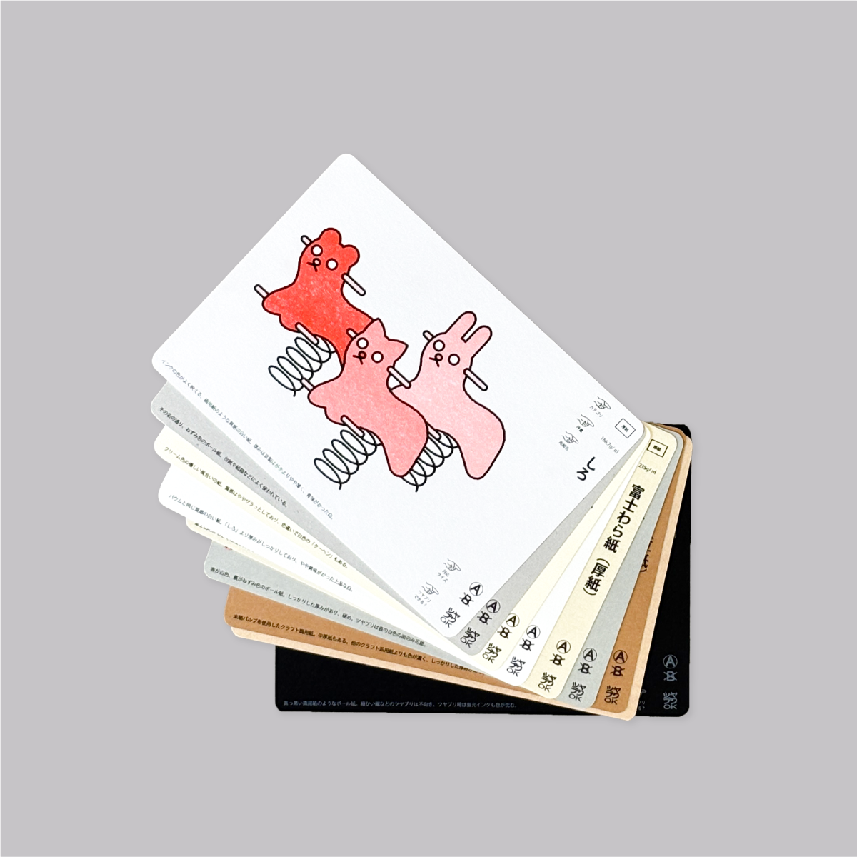 レトロ印刷で扱う用紙全46種とインク全34色を使った紙とインクの見本チャート完全版!各紙に“あそび”をテーマにしたアイコンの34色を印刷し、紙の情報はもちろんペラ紙・中厚紙は“あそび”にまつわるイラスト、厚紙には公園にある遊具をモチーフにしたイラストが印刷された豪華仕様。イラストの遊びは実際のあそびかた説明も付いていて、とことん“あそび”にこだわったアイテムとなっています。
