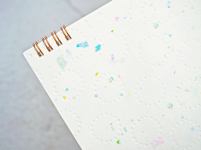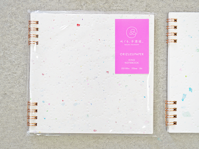 折り鶴が漉き込まれた、色とりどりの紙を表紙にしたなんとも美しいリングノートです。