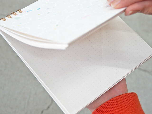 シンプルな無地のノートかと思いきや、本文の紙が2色交互に重ねられていたり、背の部分が角ばっておらず、まるっとした形になっていたりと、さりげないかわいさが感じられます。