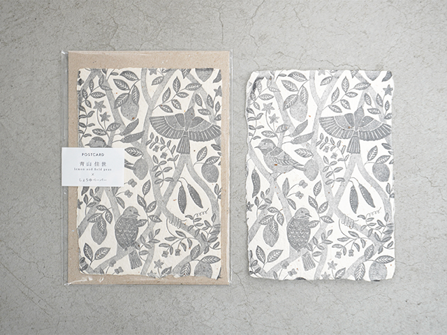 商品説明:様々な商品の製造過程で出る廃材を、福祉作業所で丁寧に漉き上げたアップサイクル紙「めぐる、手漉紙」。その独特な風合いと、様々な分野で活躍する表現者の作品がコラボレーションしたアートカードです。手漉きならではの柔らかなクッション性に、活版印刷の深い陰影が重なり、手触りも楽しめるアートです。