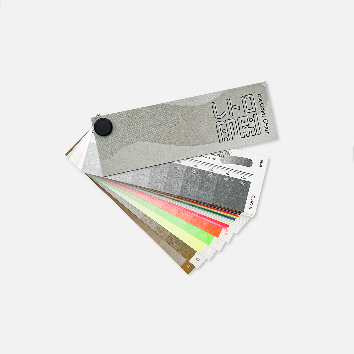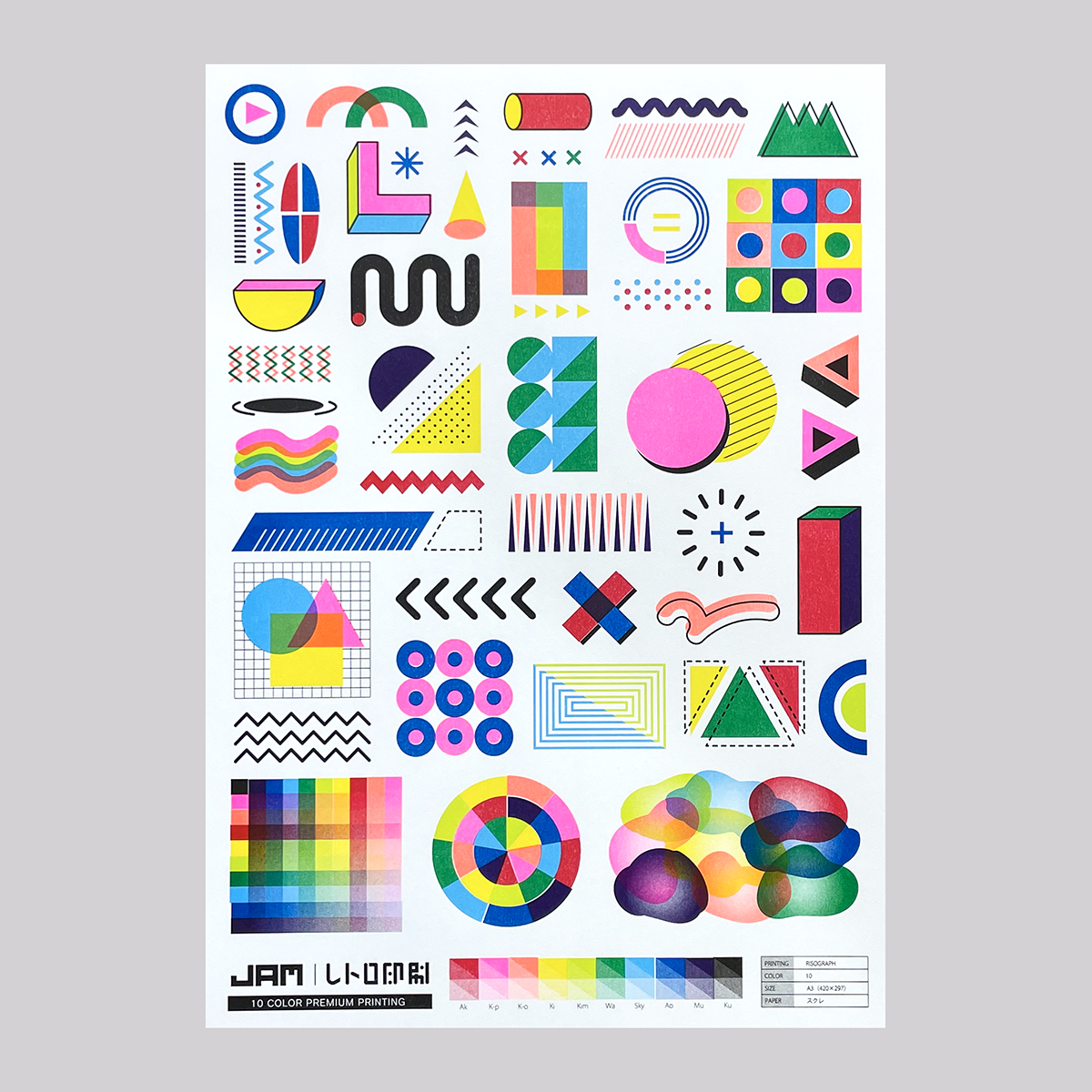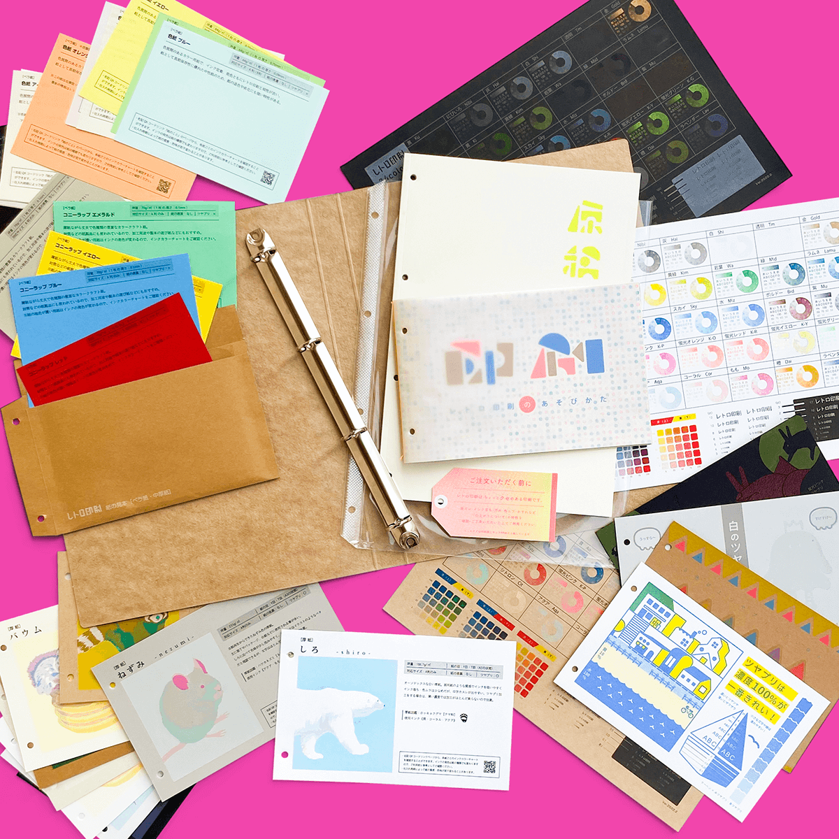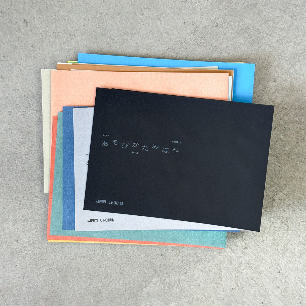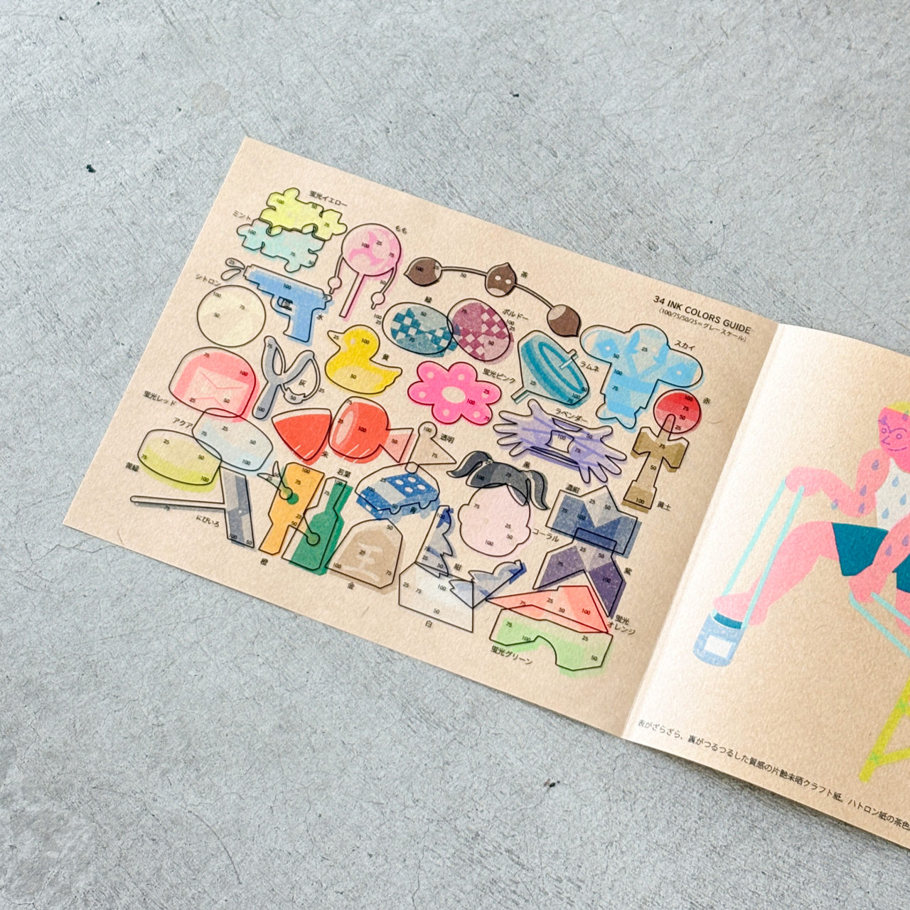 レトロ印刷のレギュラーインク34色を、現行用紙約50種類全てに印刷しました!透明シートを重ねるとインク名と濃度が確認できる楽しい仕様です♪「あそび」をテーマに作成した多色刷りイラストと解説・分版も読み応えアリ。データ作成の力強いお供となりますように!