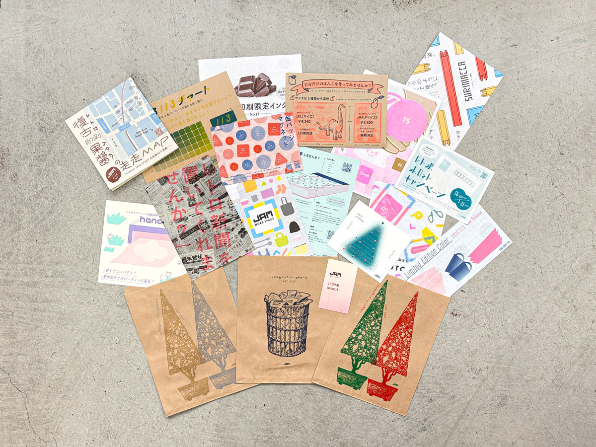 JAMのことがわかる盛りだくさんのフライヤーセットを各日200部限定で配布します!台湾店舗の近隣オススメマップや、金インクを使ったクリスマスカード、インク混色見本など、印刷見本としても楽しめる実は豪華な内容です。イベント限定で印刷した特製封筒に入れてお渡しします。
